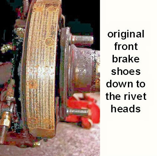 with the drum off (two countersunk screws) the brake assembly looked to be in good order, although the front brake linings are well worn!