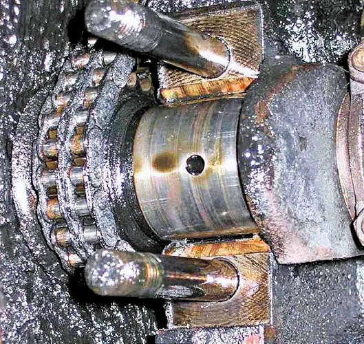 Same with the front main bearing - when the lower cap is removed, the crank is suspended from the timing chain.