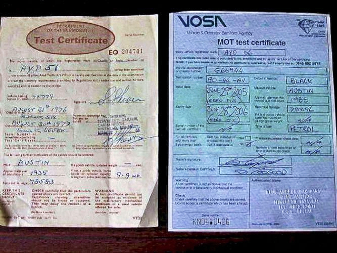 But after these two small jobs, here is the MOT certificate - together with the last Certificate from 1977. Mileage = 78,886