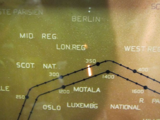 The tuning scale has holes in it which light up by the pointer when the station is tuned in - in this case, London.
