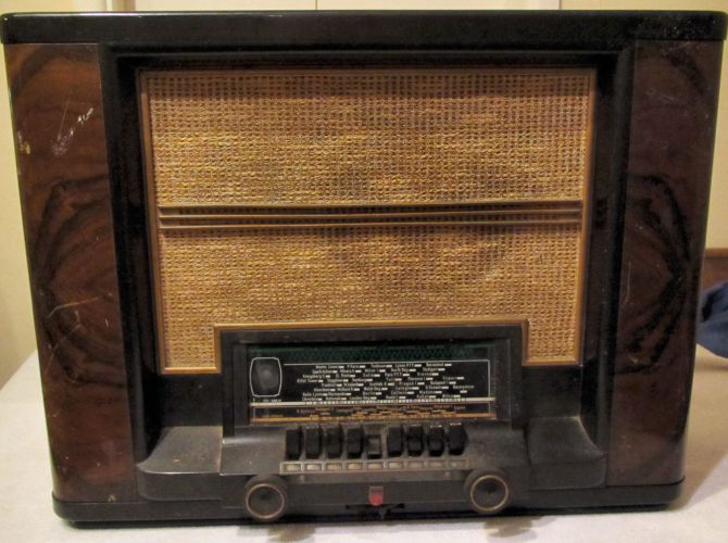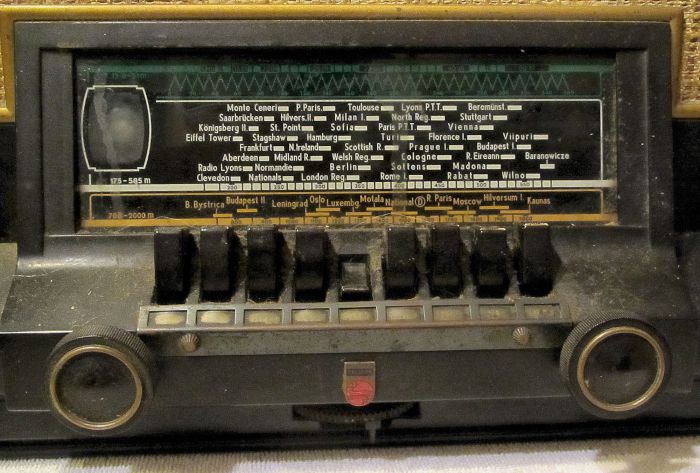 The tuning scale (as found and not cleaned up). The first six keys are for specific stations; the right three to select a waveband