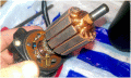 Brush size is square section 4mm x 4mm x 8mm long (round off edges to prevent sticking) - another has filed down 5mm x 5mm x 15mm brushes from a shop selling radio controlled models so do check first. I am also told that the brush is much shorter than the housing in order to accommodate the spring. Also the tail on the original brush was attached to the side and runs in a slot, the ones used had it on the top end but with care you can still leave enough slack to take up as the brushes wear.